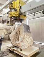 - Robot de mecanizado: es un sistema CNC, automatizado y programable, generalmente con hasta seis o incluso siete ejes, que permite realizar tareas complejas como corte, fresado, tallado, pulido y manipulación de piezas de piedra natural. Su versatilidad radica en la posibilidad de equipar distintos cabezales y herramientas especializadas, como fresas, discos de corte, sopletes para flameado, ventosas de manipulación o sistemas de resinado, adaptándose así a una amplia variedad de acabados y formas. Gracias a este alto número de ejes y a la variedad de herramientas que puede portar, el robot es capaz de ejecutar operaciones tridimensionales de gran precisión, optimizando los procesos de producción, reduciendo tiempos de ciclo y permitiendo la fabricación eficiente de piezas ornamentales, arquitectónicas y funerarias con un elevado nivel de detalle y calidad.