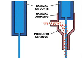 Estas máquina también funcionan con un sistema de control numérico computarizado, estando el chorro de agua controlado por un sistema de CNC, lo que permite seguir recorridos complejos con un alto grado de precisión. El sistema funciona al enviar el agua a una presión extremadamente alta (alrededor de 4.000 – 6.500 bares, como unos 4.000km/h, una velocidad supersónica) a través de un chorro de pequeño diámetro, que puede ir acompañado o no de un abrasivo (granate ou garnet) para cortar materiales duros como la piedra. El motivo de añadirle abrasivos al agua es debido a que el simple chorro de agua no sería capaz de realizar cortes en los materiales más duros, por eso se le añaden mezclas de arcillas y vidrios que dotan al sistema de un corte más potente.