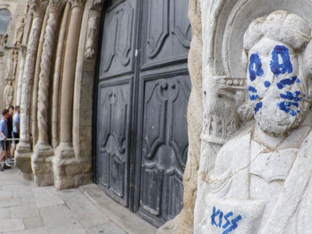Pintada Graffiti en la Catedral de Santiago. Fuente: https://www.elconfidencial.com/espana/galicia/2018-08-06/pintadas-catedral-santiago_1601773/